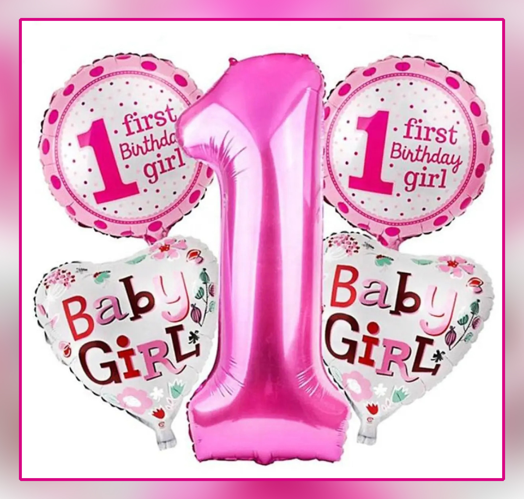 1st Birthday Girl Pink Foil Balloon Set – Pack of 5 Balloons (2 Round + 2 Heart + 1 Number 1 Balloon)