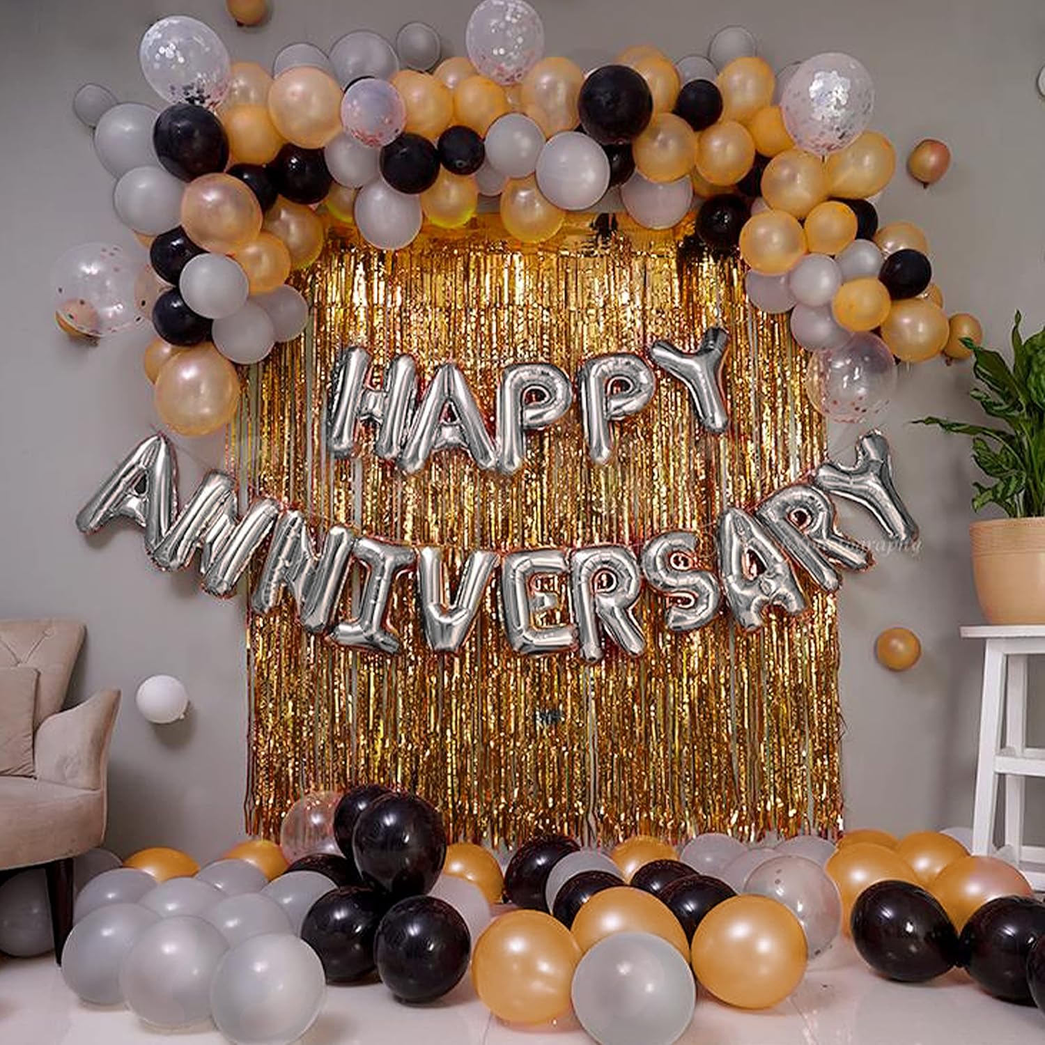 47Pcs Happy Anniversary Decoration Set – Foil Banner, 30 Balloons & Foil Backdrop Curtain – Elegant Anniversary Decor for Room & Home Celebration