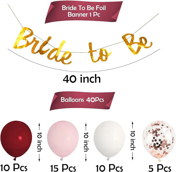 41Pcs Bride To Be Decoration Set – Maroon, Pink, White & Rose Gold Confetti Balloons with Golden Bride To Be Banner – Bachelorette Party Decoration