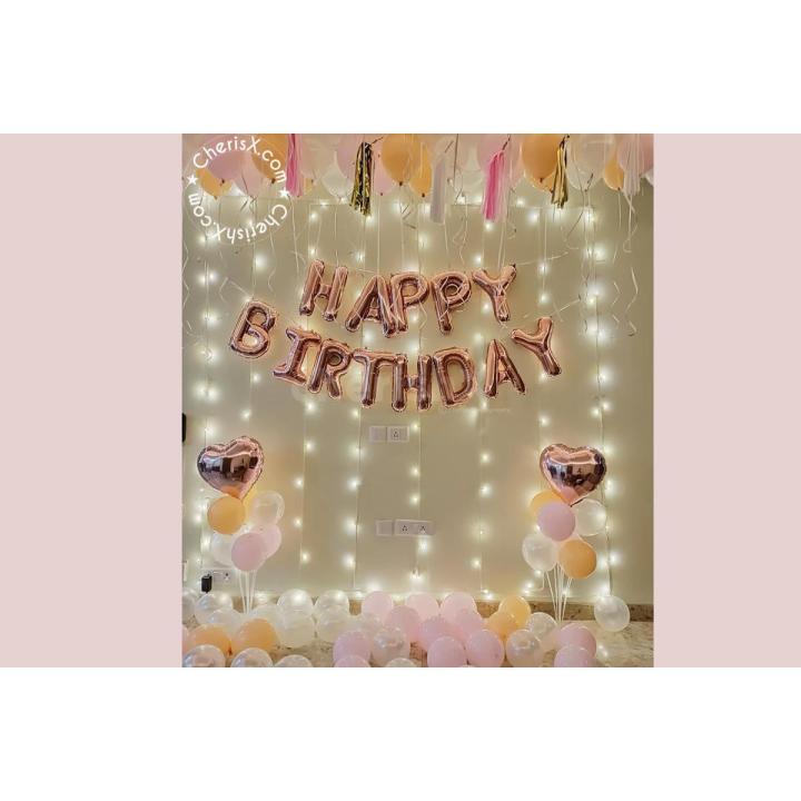 46 Pcs Rose Gold Birthday Decoration Set with Foil Banner, Balloons, Heart Foils & Fairy Light – Premium Quality Birthday Decoration Set Elegant Party Accessories