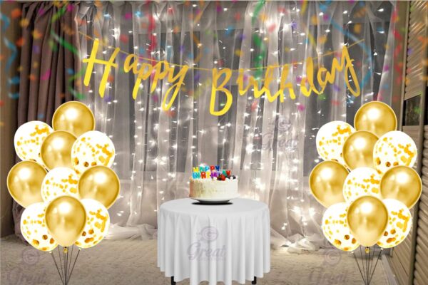 Shine bright with our 32 Pcs Golden Happy Birthday Decoration Set! Includes golden banner, 20 balloons, 10 confetti balloons, and a fairy LED light – the perfect premium décor kit for kids, boys, girls, and adults.