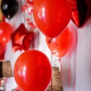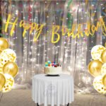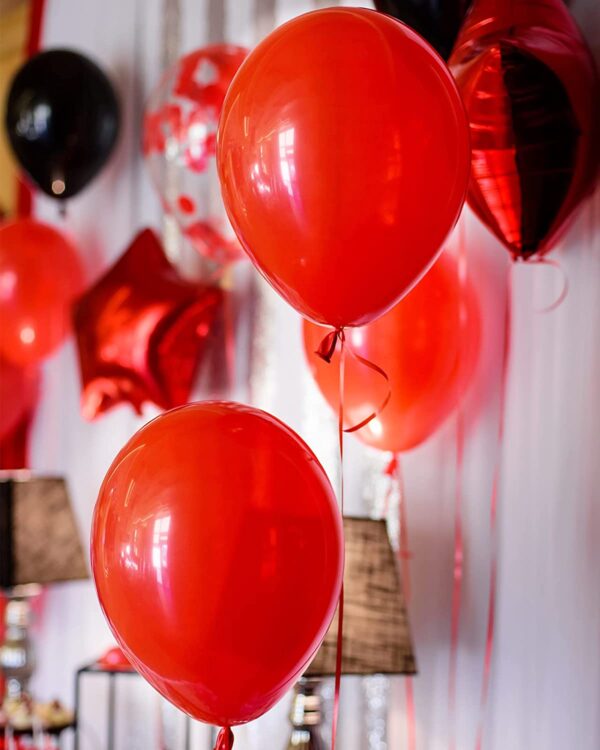 This set includes 30 metallic red & golden latex balloons, a 13 pcs golden foil “Happy Birthday” banner, 1 red heart foil balloon, 1 golden star foil balloon, and a fairy LED light that creates a warm and magical party glow.