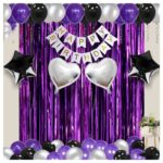 Birthday Decoration Set – Purple, White & Black Theme for Girls & Boys | Balloons, Banner & Lights